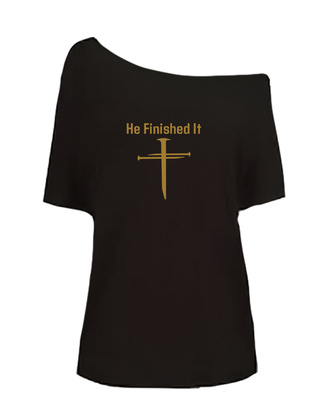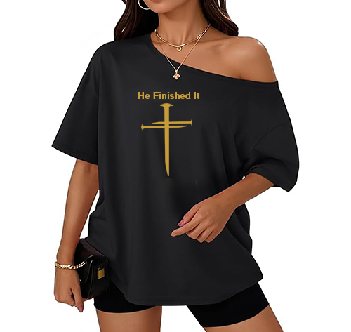 Bold faith meets effortless style with our He Finished It off-shoulder tee. Designed with a relaxed fit and chic one-shoulder cut, this piece is both comfortable and empowering. We have two styles one features a striking gold cross formed from nails with the words “He Finished It! , and He Finished It on top and To Redeem Us” on the bottom. This is a powerful reminder of Christ’s sacrifice and victory.